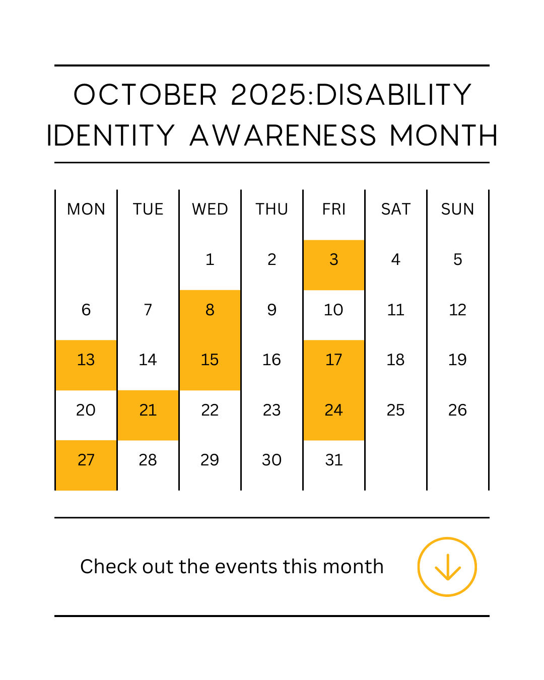 At UMBC, we invite our community to join us in celebrating disability identity through events, conversations, and activities designed to foster inclusion, understanding, and connection. Events are happening throughout October on the highlighted dates, with some hosted by the UMBC ADS/SDS Office and others by Instructional Technology. From engaging conversations to hands-on workshops and community-building activities, these events provide opportunities to learn, connect, and celebrate the diverse experiences of our UMBC community.