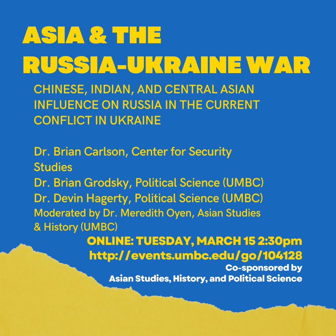 Tuesday, March 15 at 2:30pm, join Dr. Brian Carlson from the Center for Security Studies for a panel discussion. Together with Dr. Brian Grodsky and Dr. Devin Hagerty from UMBC's Political Science department, will consider the influences and roles of Russia's Asian neighbors in the current conflict in Ukraine. Dr. Oyen will moderate the conversation.