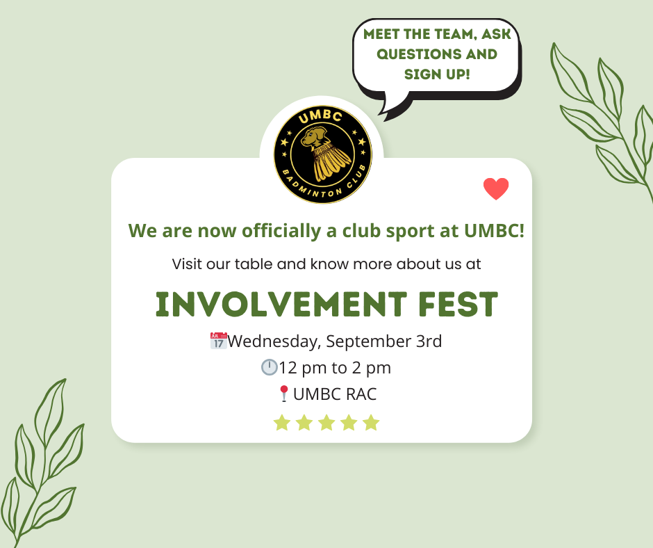 Hi all! Happy Fall semester. As we start the journey of club sports season 1.0, come stop by at our table at the Involvement Fest happening on Wednesday, September 3rd, from Noon to 2 pm at the RAC.