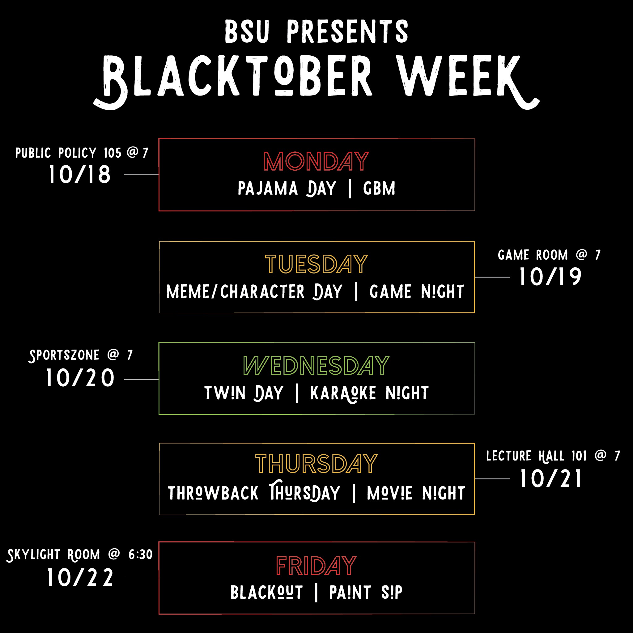 Good morning everyone, BSU will be having BlackTober Week. It is going to be a spirit week with themed days and events going on at night. I want everyone to pop out and show out. (Ps. There’s gonna be a recap video