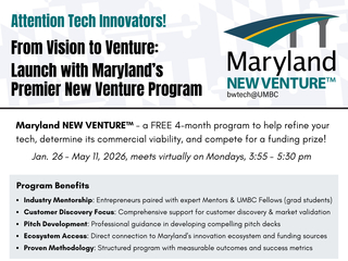 Attention Tech Innovators! Maryland NEW VENTURE™ - a FREE 4-month program to validate your tech, develop your pitch, and compete for a funding prize! Program Dates: Jan. 26 - May 11, 2026,...