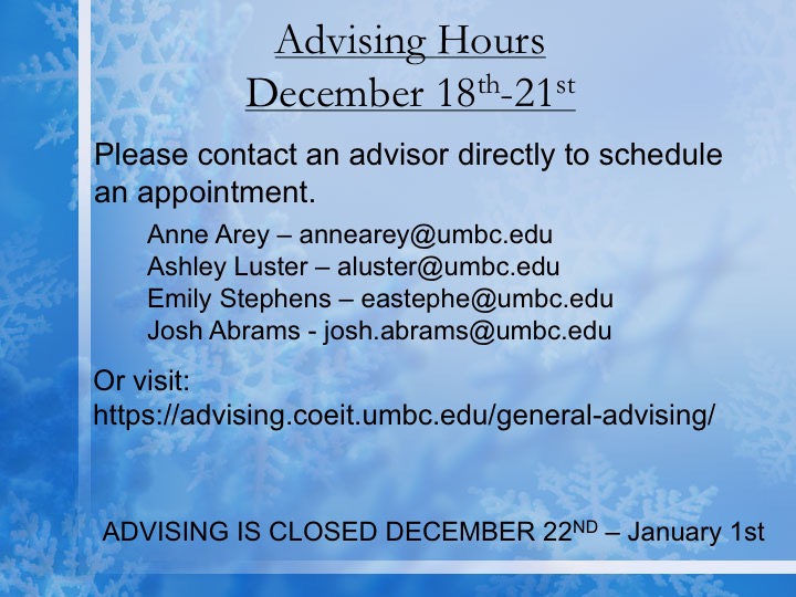 Our advising offices are located in ITE 202-206. Email and telephone contact information is available here.