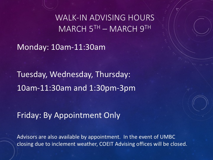 Our walk-in hours are posted below. In the event of UMBC closing due to inclement weather, COEIT Advising offices will be closed.