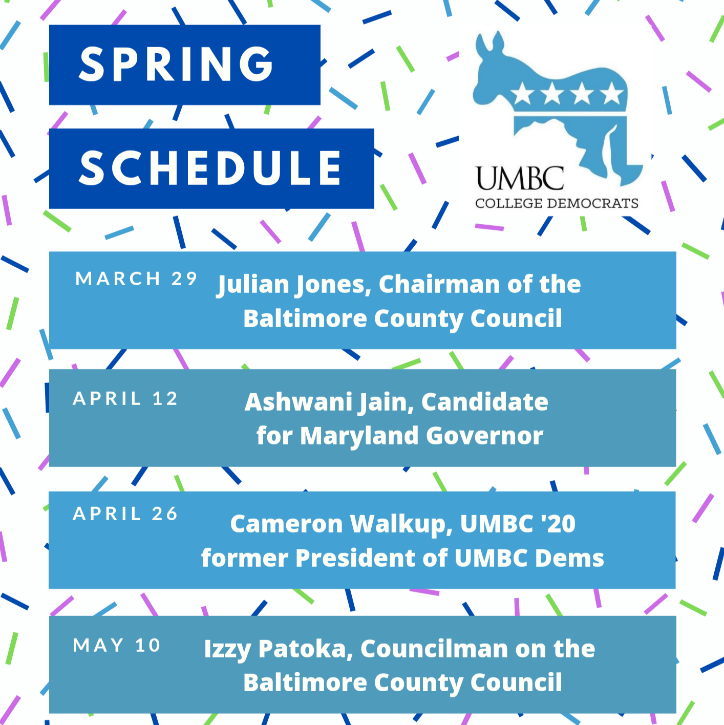 We have a full line-up of guest speakers prepared for the rest of the semester! All events will be on Mondays at 7 pm. Links will be provided in each myUMBC event and on our Twitter @UMBCDems. Who are you most excited to see?