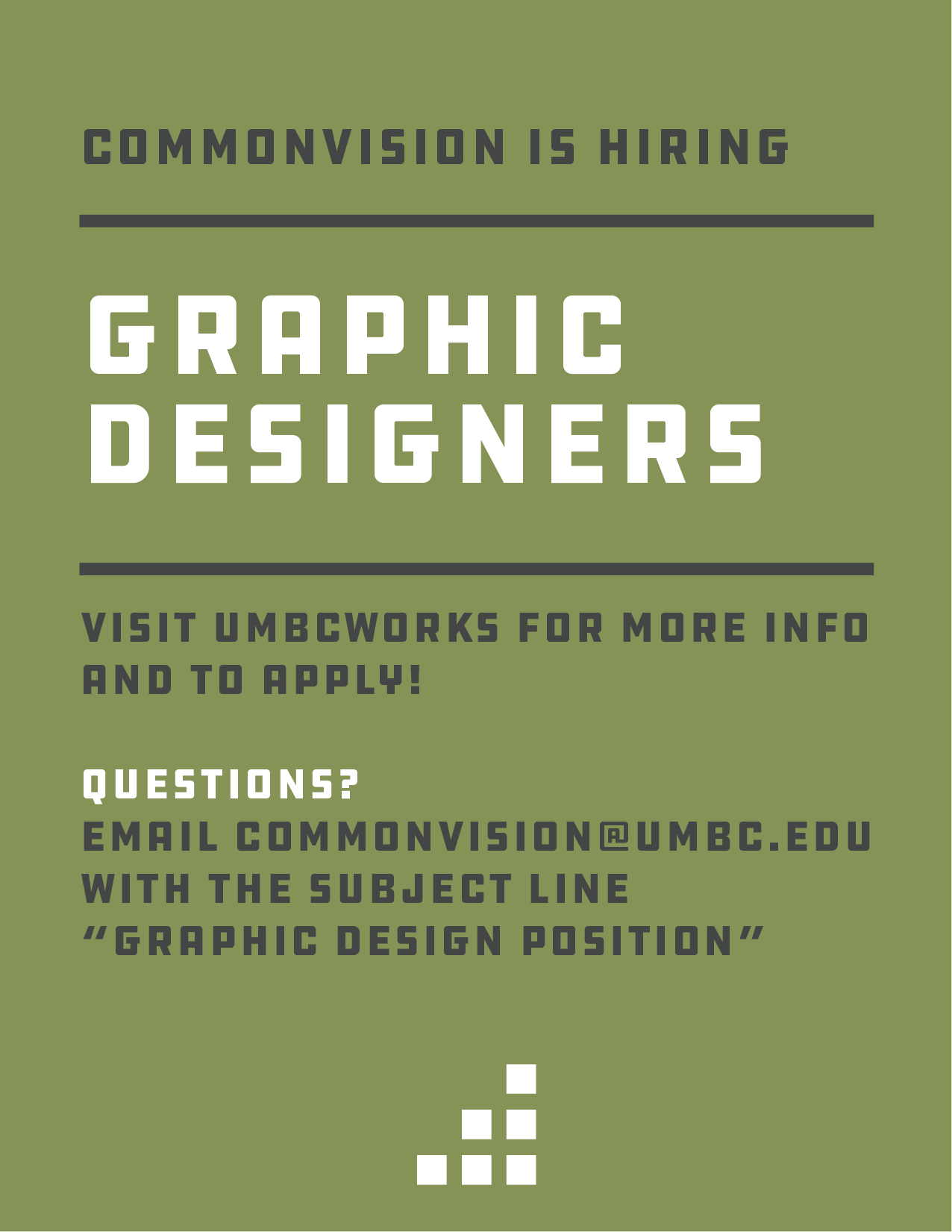 via UMBCworks. Anything you are not able to submit there please e-mail commonvision@umbc.edu with the subject line “commonvision Designer Application Summer 2019”.