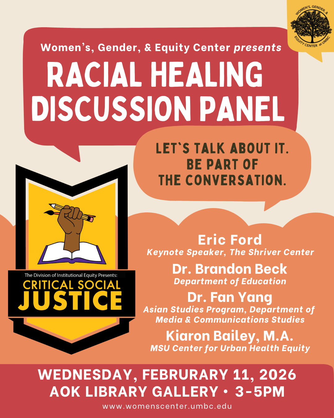 As part of our upcoming Critical Social Justice (CSJ) Week, you are invited to the WGEC's Racial Healing Discussion Panel on February 11th from 3-5pm at the AOK Gallery Library. Critical Social Justice Week is a UMBC campus-wide initiative dedicated to deepening our collective understanding of equity, inclusion, and community care. CSJ Week invites students, staff, and faculty to engage in meaningful conversations about justice and belonging within and beyond the university. Come listen in or discuss how campus communities can strive for racial equity and open dialogue.