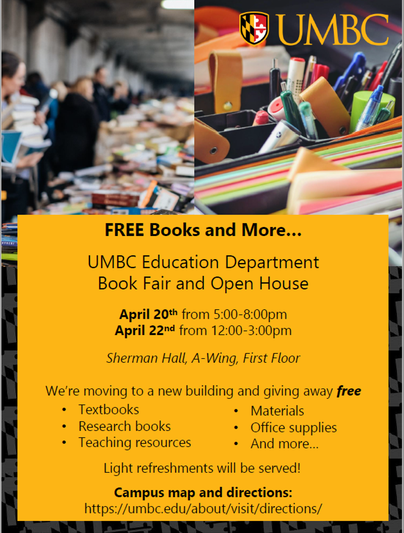 The UMBC Department of Education is moving to a new building, and we will be holding two book fairs/open houses to give away items that we cannot take with us. We invite you to stop by the first floor of Sherman Hall (A-Wing) on UMBC's campus to meet up with faculty and staff, enjoy some light refreshments, and take FREE books and supplies.
