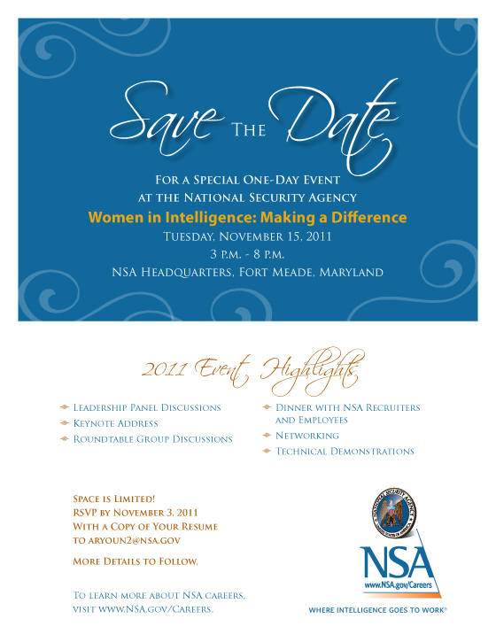 RSVP by November 3rd, 2011 with copy of your resume to aryoun2@nsa.gov