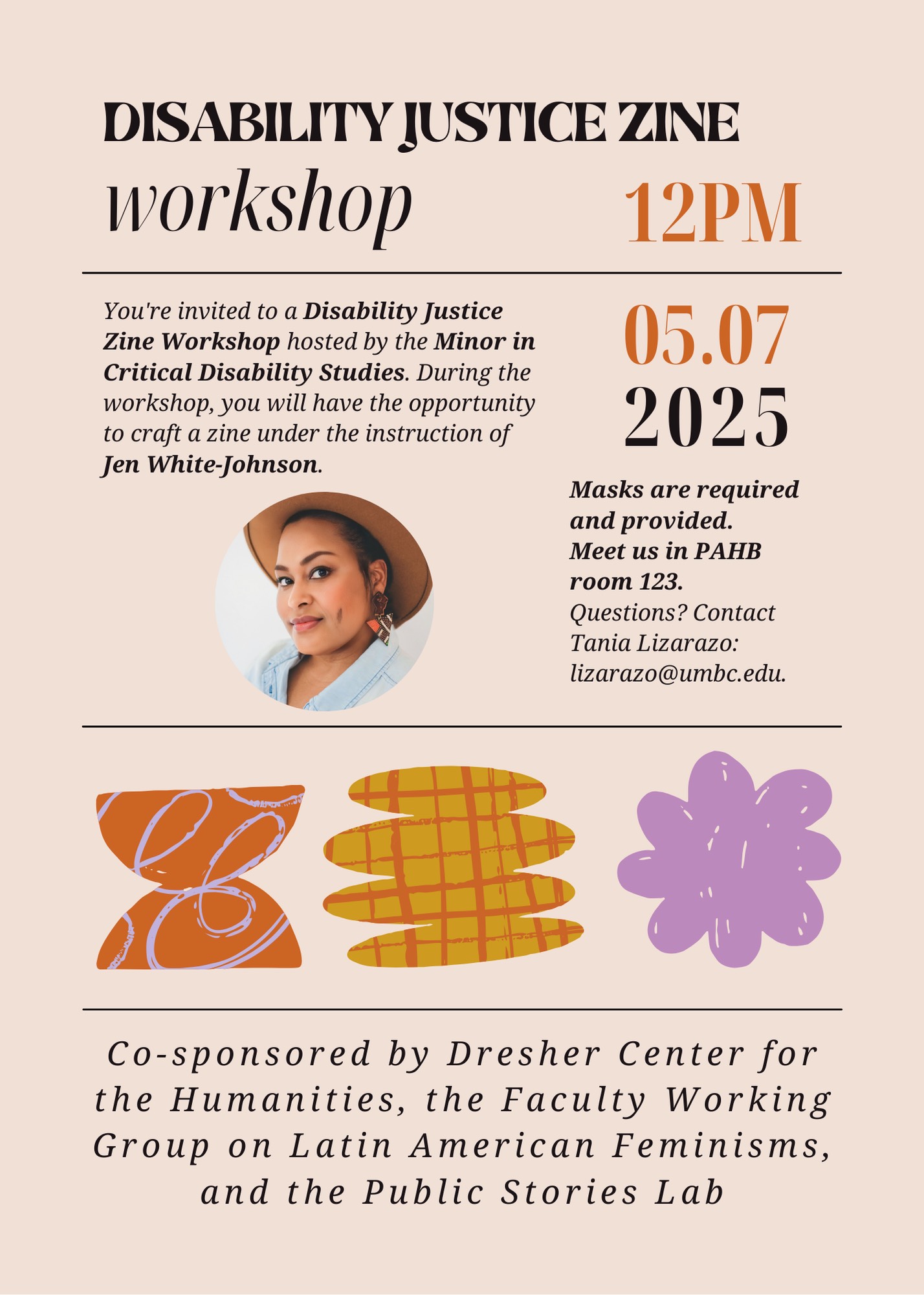The image is a promotional flyer for a "Disability Justice Zine Workshop." It features a clean design with a beige background and a black and orange color scheme. At the top, bold text reads "DISABILITY JUSTICE ZINE" and "workshop" underneath, separated by a line. Below is information about the event, inviting attendees to partake in a zine-making workshop hosted by the Minor in Critical Disability Studies, instructed by Jen White-Johnson. On the right, the time "12PM" and date "05.07 2025" are prominently displayed in large orange text. A circular photo of a person wearing a hat and earrings is located left of the text. There are additional details including venue, mask requirements, and contact information. Decorative abstract shapes in orange, yellow, and purple adorn the lower part. The flyer is co-sponsored by several organizations.