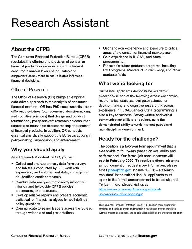 Visit our website: https://www.consumerfinance.gov/about-us/careers/current-openings/research-assistant-158x/.