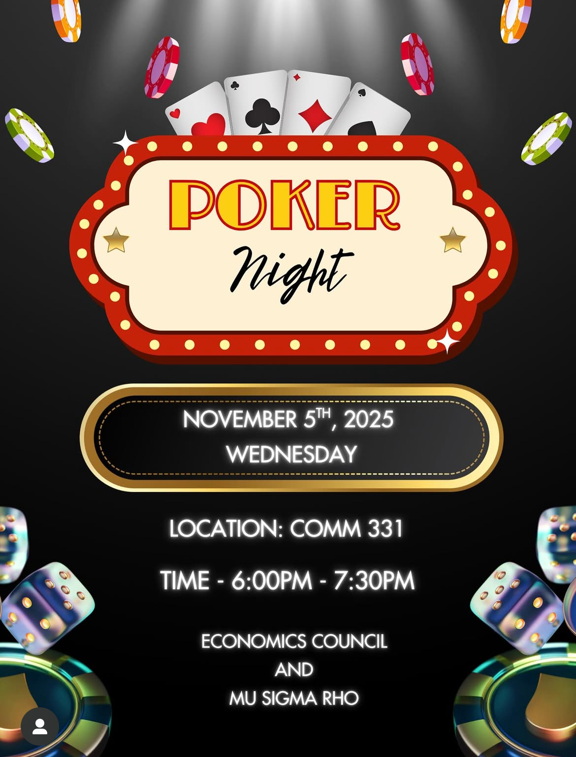 Join the Economics Council and Mu Sigma Rho for an exciting Poker Night on TODAY from 6:00–7:30 PM in Commons 331!