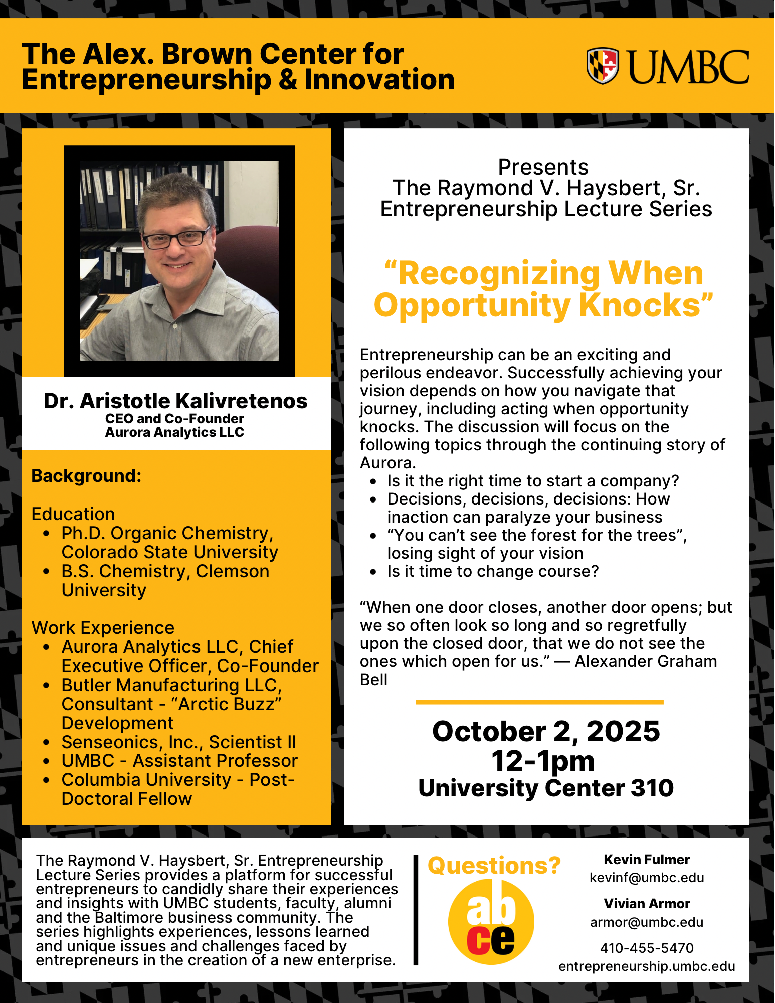 Join us for an inspiring session on Thursday, October 2, 2025, from 12–1 PM in University Center 310! This event will feature Dr. Aristotle Kalivretenos, CEO and Co-Founder of Aurora Analytics LLC, who will share his journey from academic research to launching a successful startup.