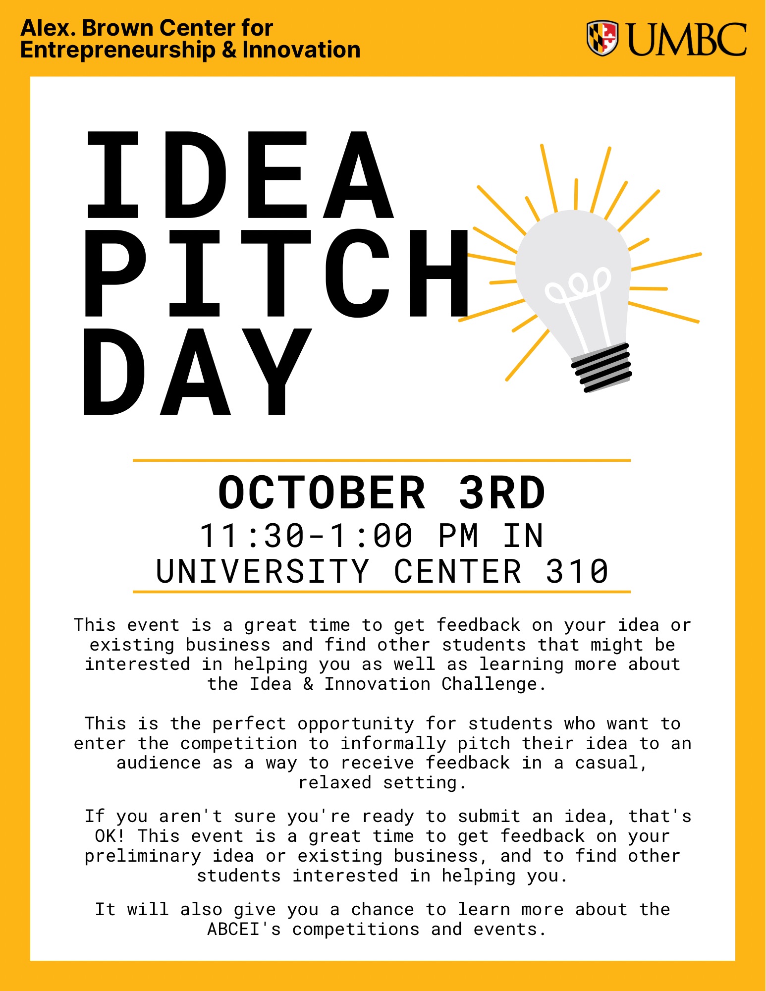 Bring your brightest idea and curiosity to Idea Pitch Day on Friday, October 3, 2025, 11:30 AM – 1:00 PM in University Center 310.