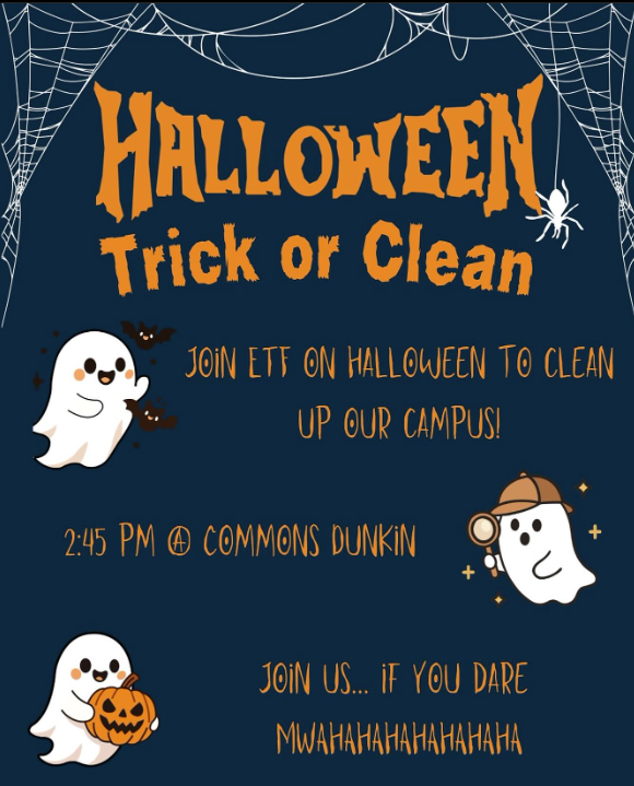 Here at ETF if there's anything scarier than a malevolent ghost, it's gotta be trash. So we face our fears by picking it up! Come join us if you dare, and we'll all enjoy ridding our beautiful campus of some stinky, stinky trash.