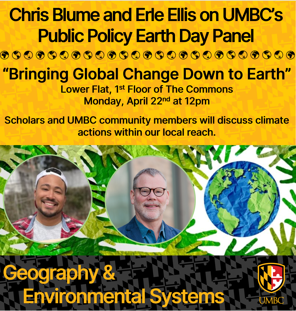 On Earth Day, April 22nd, the School of Public Policy will be hosting a climate policy panel. Among the panelists are two members of our GES Department! Chris Blume completed his Master of Science degree last year and was an ICARE student. Erle Ellis is a professor in our department, specializing in sustainable landscapes and global change.