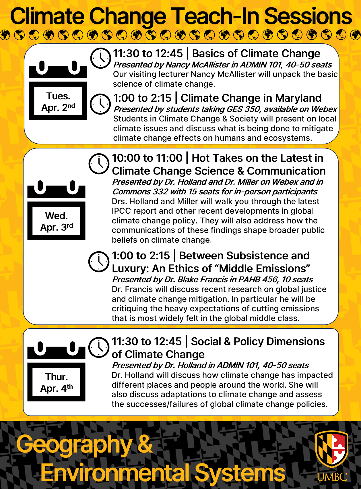 The GES Department invites all students to join us for next week’s climate teach-ins! Several professors in our department will be holding specialized talks about climate change. From local climate change adaptations to critiques of global policies, we’ll be covering a broad range of topics. Some events will be streamed on Webex, while others are limited to in-person attendance (first come first serve!). These teach-ins will be the first of many April GES events on environmentalism, so stay tuned!