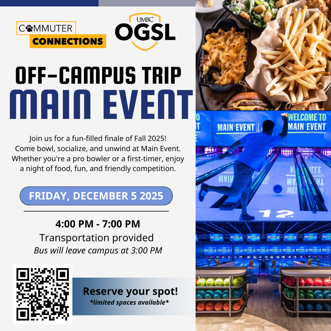 The Office of Graduate Student Life and Commuter Connections is hosting a off-campus trip to Main Event Friday, December 5, 2025. Join us for a fun-filled finale of Fall 2025! Come bowl, socialize, and unwind at Main Event. Whether you're a pro bowler or a first-timer, enjoy a night of food, fun, and friendly competition. Please reserve a spot if you'd love to have fun with us!
