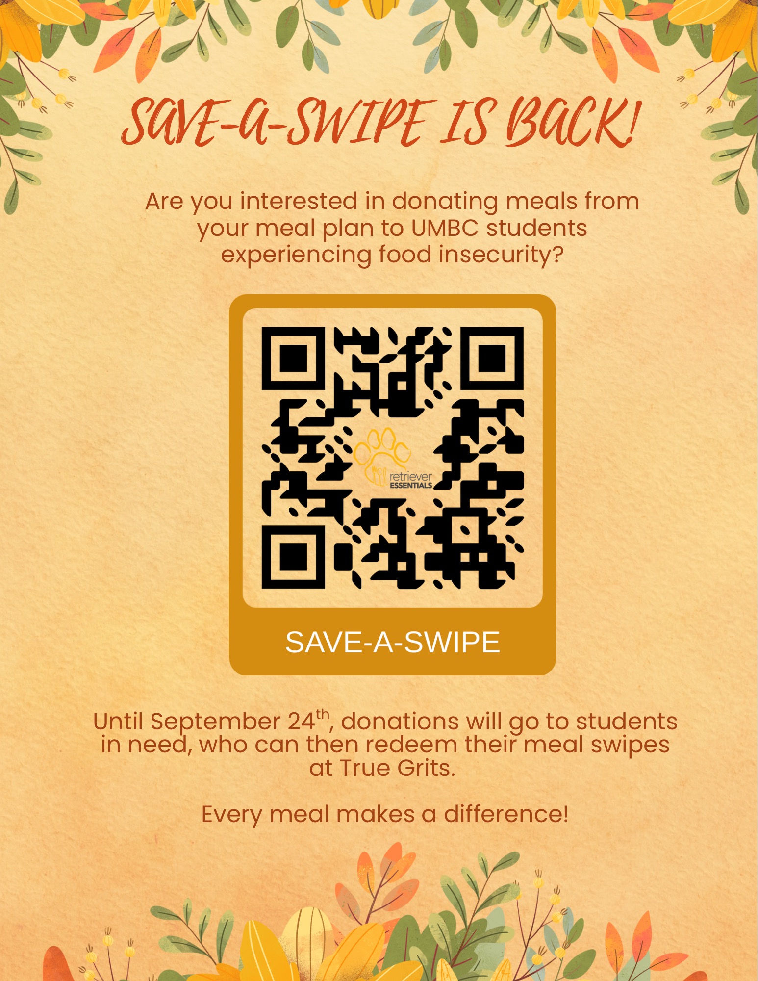Feel like making a difference in your community? If you own a meal plan through UMBC, you are eligible to donate to our Save-a-Swipe program! You can donate 5-10 meals to Save-a-Swipe, where they will be pooled and delegated to students suffering from food insecurity later in the semester. We are very happy to announce that our program is back for the fall semester, and we look forward to how many lives we can change!