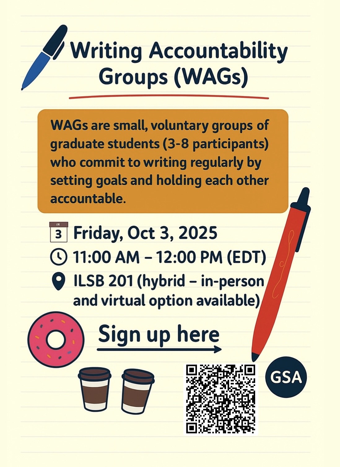 Who: WAGs are comprised of a group of graduate students (usually 4-8 participants per group) interested in developing writing habits and accountability