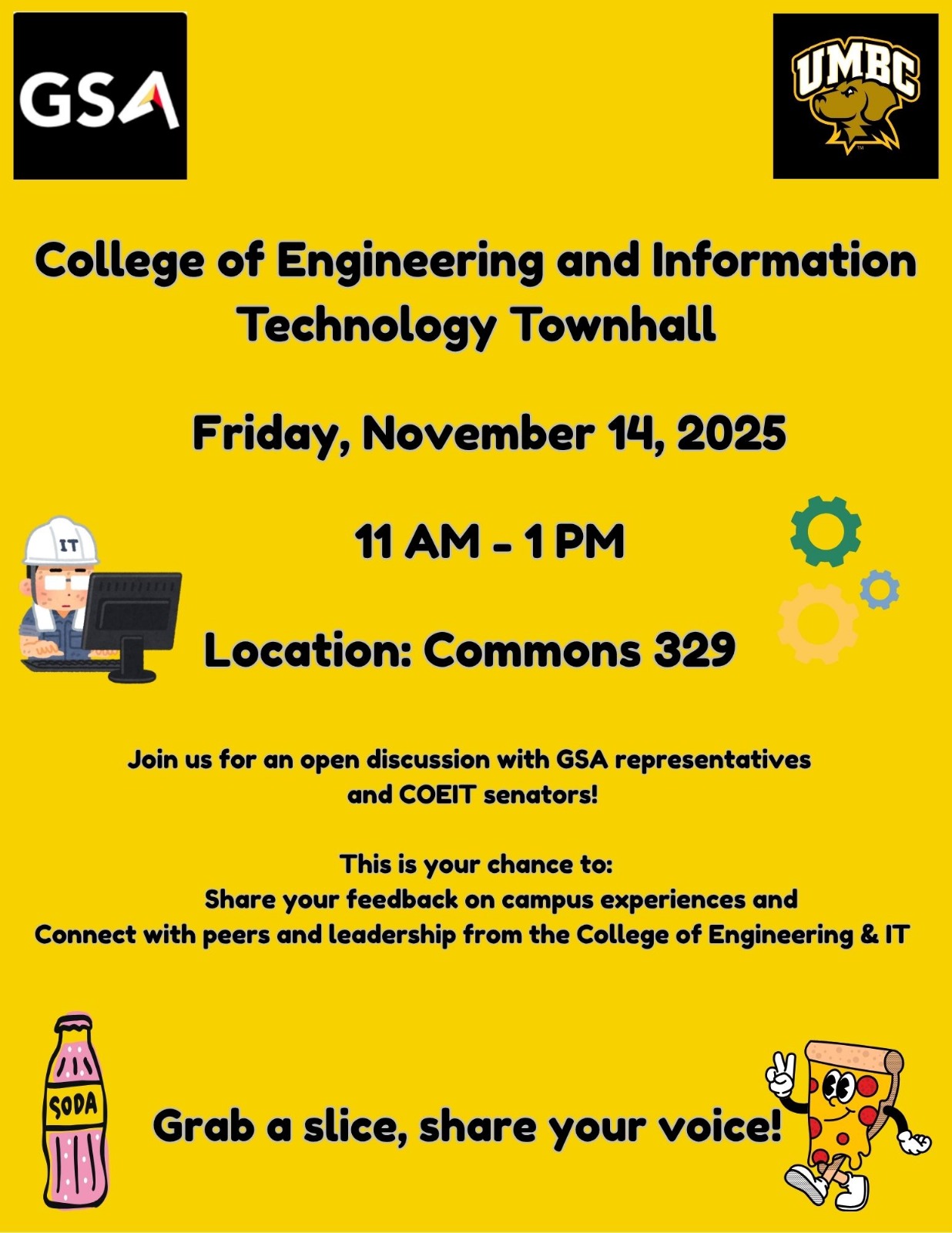 Join us NOW for an open discussion with GSA representatives and COEIT senators! This is your chance to share feedback on campus experiences and connect with peers and leadership from COEIT!