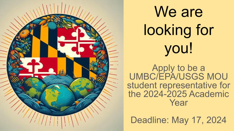 If you meet the qualifications and are excited about this opportunity, we encourage you to apply by completing the application form by May 17, 2024. More information can be found on the UMBC/EPA/USGS Website: https://epa-usgs.umbc.edu/.