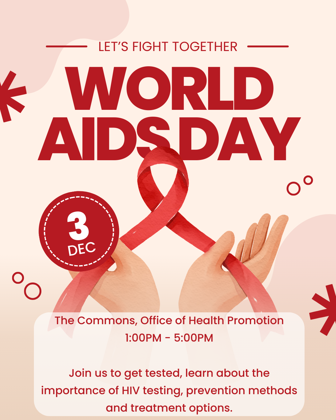 Join us on Wednesday, December 3rd, from 1:00 PM-5:00 PM in The Commons, 1A02 (next to the bookstore) for FREE, ANONYMOUS HIV testing.