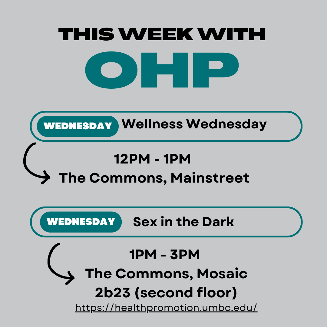 After Wellness Wednesday, join the OHP staff and Peer Health Educators for an event on all things sexual health. Play a game of hot or not, red flag/green flag, and then open discussion on sexual health topics like STI/STD testing, consent, boundaries, and relationships. We'll have snacks and giveaways!