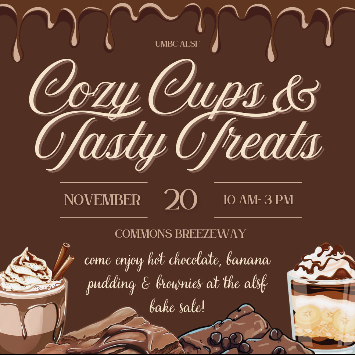 Come to our Bakesale for some yummy treats and hot chocolate on Wednesday, Nov 20th from 10 am - 3 pm at the Breezeway. Support and contribute to the cancer research fundraiser!