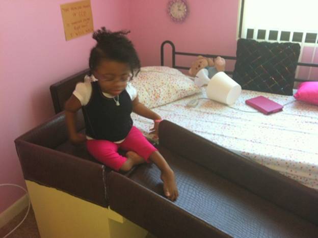 Under the guidance of Dr. Andy Conn (V-LINC) and Dr. Neil Rothman (UMBC), the students designed and built composite wood/foam ramps (pictured below). The ramps had to meet strict dimensional requirements to both fit within the cramped space in Hannah's bedroom and bathroom and to provide the gentle incline that she can navigate. However, the ramps also had to be light enough for Hannah's mother to be able to remove them when necessary.
