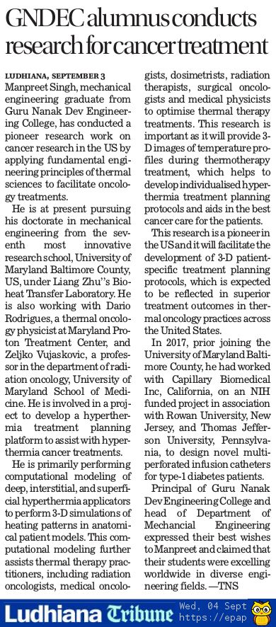 Singh's Ph.D. work under Dr. Liang Zhu and his summer Internship work is featured also in another indian national newspaper the Tribune. Singh says: "It is a great honor to work under Dr. Liang Zhu's supervision and be part of the Mechanical Engineering Department, and a part of UMBC family as a whole. I thank everyone for their support."