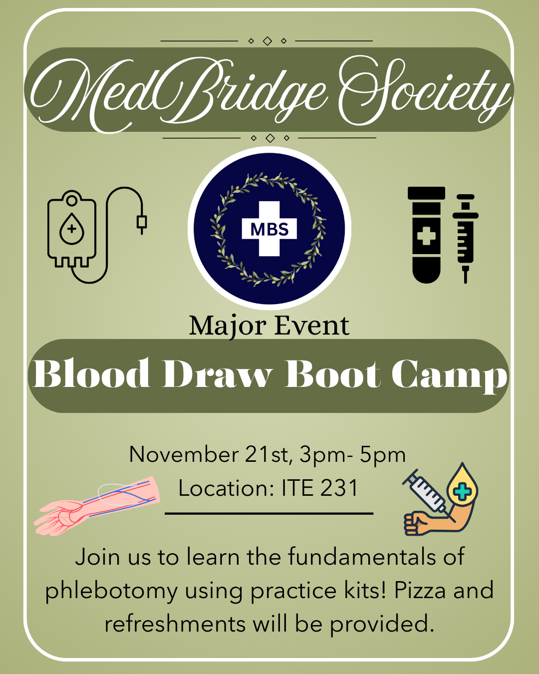 Join us on Friday, November 21st, from 3–5 PM in ITE 231 to learn how to manually draw blood using practice kits and insights from experienced phlebotomists!