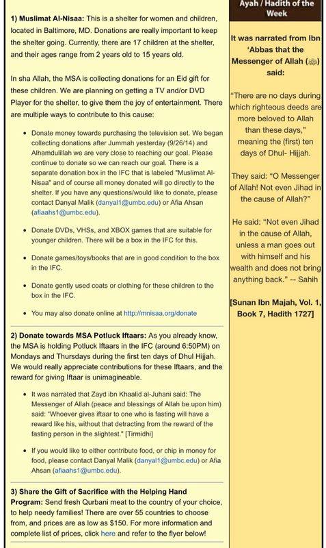 We are collecting donations for the children at Muslimat Al-Nissa, for an Eid gift. You may drop off donations either in the donation boxes at IFC or at our MSA/Dawah Table tomorrow (11am-2pm in Breezeway)