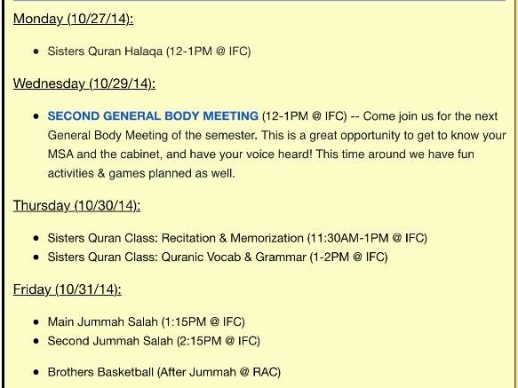 Thanks again to everyone who came out to Thursday's event and made it successful! Now that the weekend is over it's time to look ahead to the schedule for this week. *Please note that Wednesday we will NOT be having Open Spaces, but rather, our 2nd General Body Meeting. So come out because this gives us a chance to hear from all of you! We also have some activities prepared, so come out if you can insha'Allah
