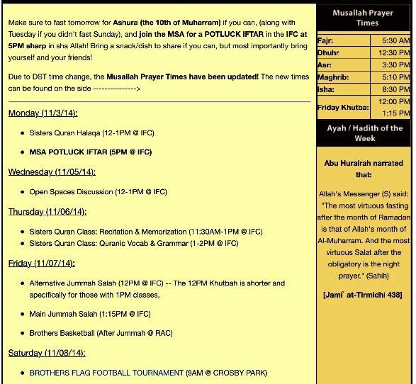 Here is the weekly schedule of events. Please keep in mind that prayer times have changed since the end of DST. Also we will be having a small potluck in the IFC tomorrow for those fasting the day of Ashura to break their fast.