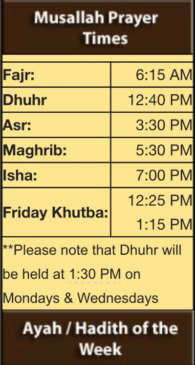 There is also an Alternate Jummah Salah (Arabic only and very short) at 12:25. We recommend those students who have 1 PM classes to attend this Jummah ONLY and that the rest benefit from the Main Khutbah at 1:15.