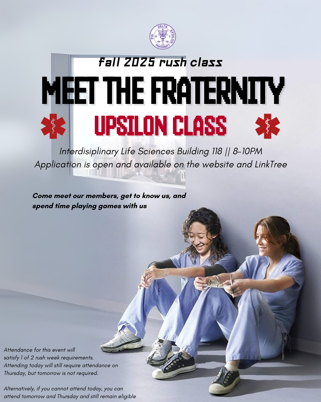Welcome to Day 3 of our Fall 2025 Rush Week for Upsilon Class! This is a reminder that tonight is our Meet The Fraternity event, which will be in the Interdisciplinary Life Sciences Building Room 118, from 8PM to 10PM.