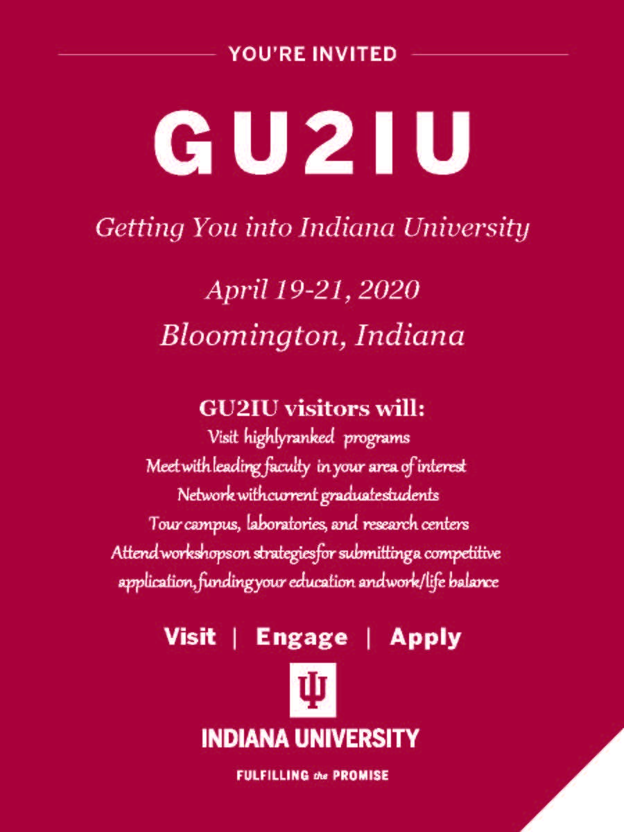 This is an all-expense paid trip for selected highly qualified applicants including air fare, lodging, and meals. Participants will learn more about IU’s Ph.D. and M.F.A. programs, research opportunities and funding options. Additionally, participants will meet with faculty, staff and current graduate students, attend sessions on preparing competitive applications for graduate admission, explore campus cultural centers, and take a campus tour.