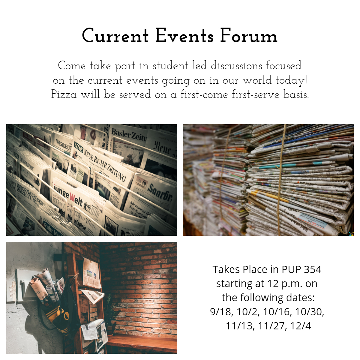 Just a friendly reminder that the start of the Current Events Forum is this Wednesday at 12 p.m. in PUP 354! More info regarding the event can be found below.