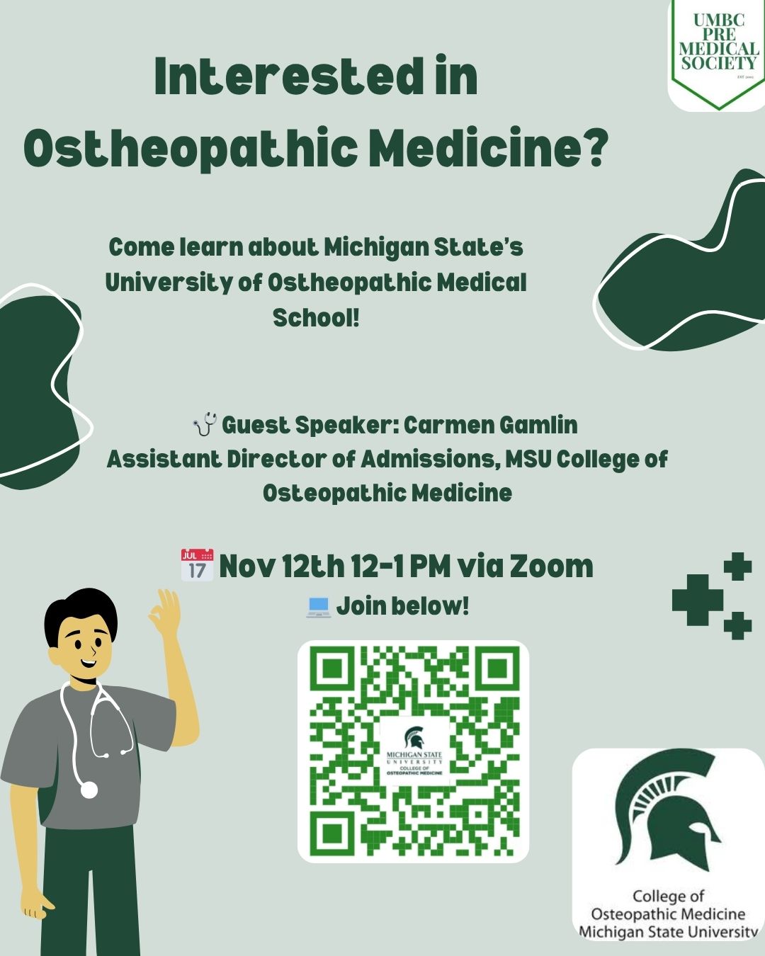 Join us on Wed, Nov 12 from 12-1pm to hear from MSU College of Osteopathic Medicine. Join the meeting using the link attached below or scan the QR code in the attached flyer. Come prepared with questions!! Looking forward to seeing you all there.