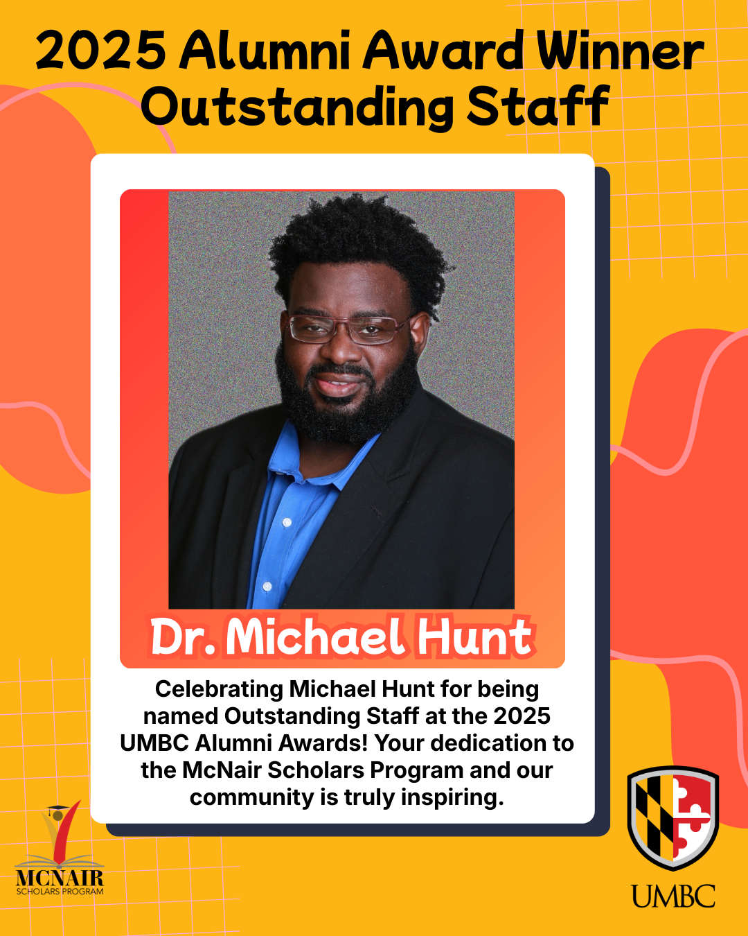 Join us in celebrating Michael Hunt '06, Ph.D. '25, Director of the McNair Scholars Program, as he is honored with the Outstanding Staff Award at the 2025 UMBC Alumni Awards! His dedication to McNair Scholars and empowering first-generation, historically excluded, underrepresented students will be recognized on October 29 at Chesapeake Employers Insurance Arena.
