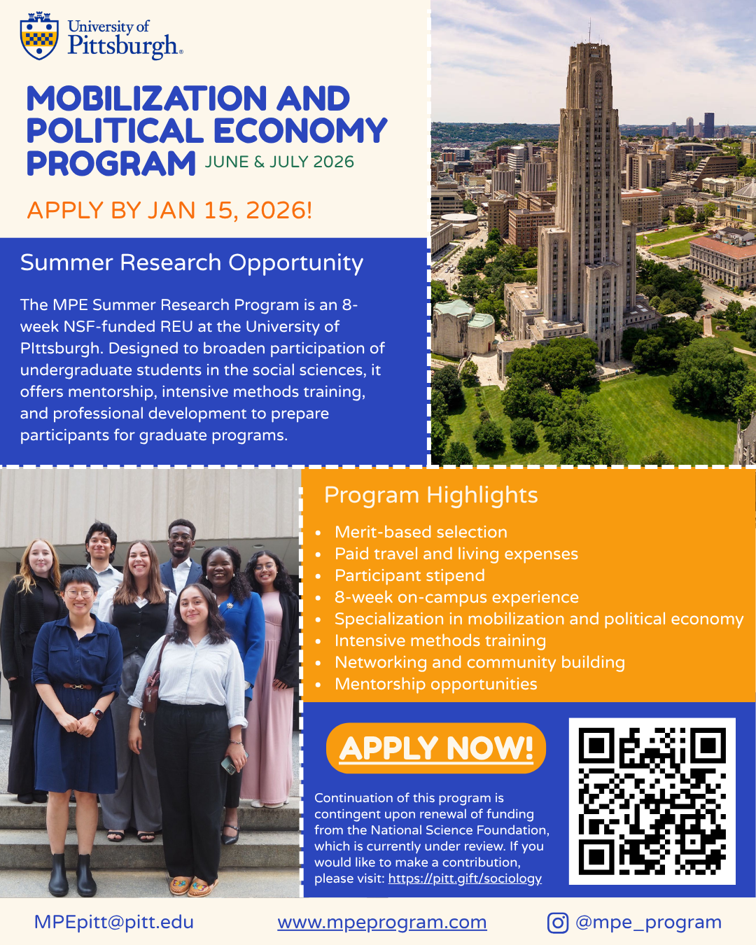 The MPE Summer Research Program is designed to broaden participation of undergraduate students in the social sciences by training them to conduct research and support their placement in graduate studies programs. This is an 8-week summer program on Pitt's campus (June-July 2026) providing undergraduate students with training in research methods, the study of mobilization and political economy, as well as research and mentorship opportunities.