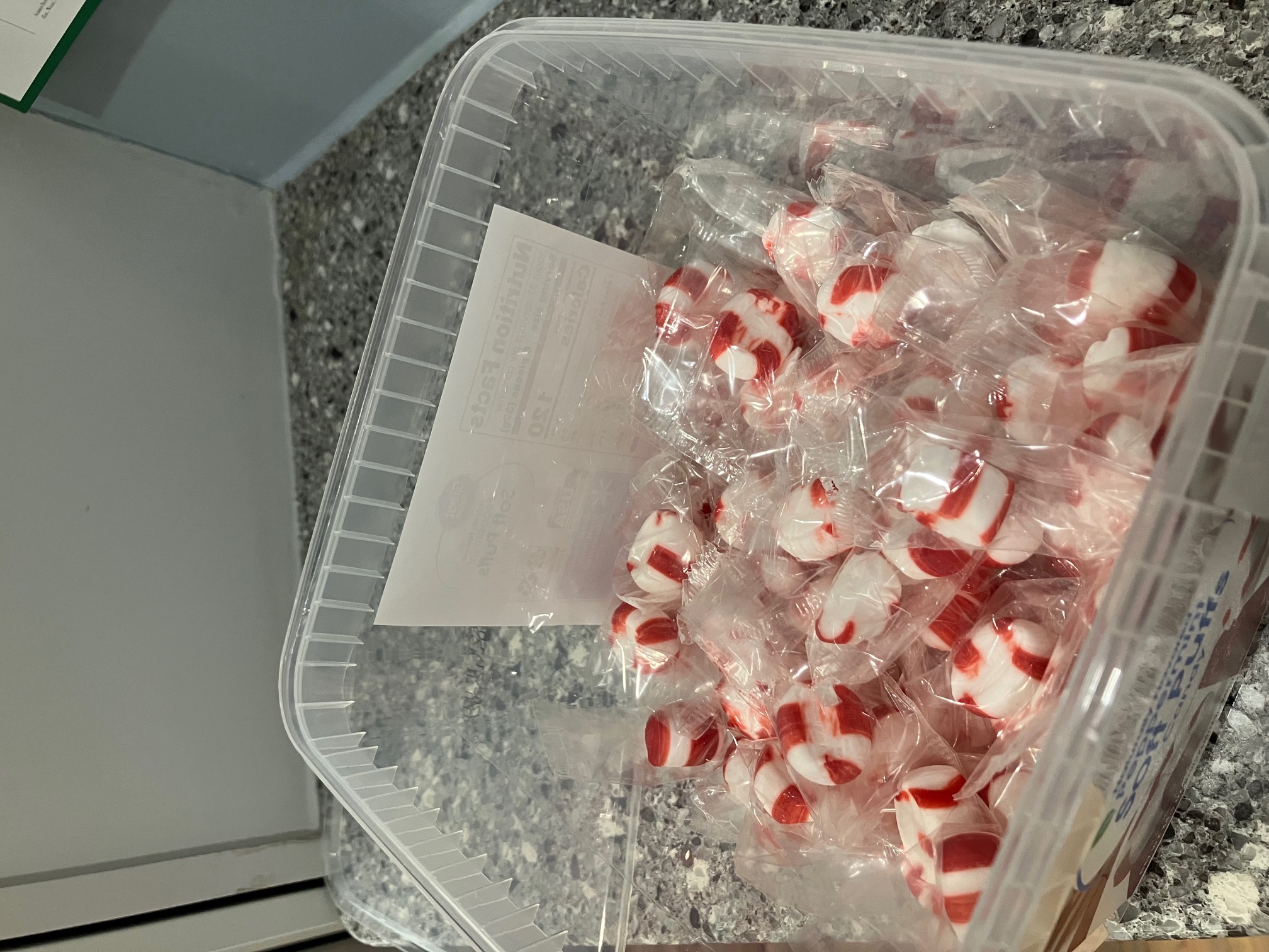 I would love to split this tub of peppermint candies with someone. There are 80-90 left in the tub, individually wrapped, don't expire until 2027. I purchased these with my own money, so you can enjoy them at home if you like.