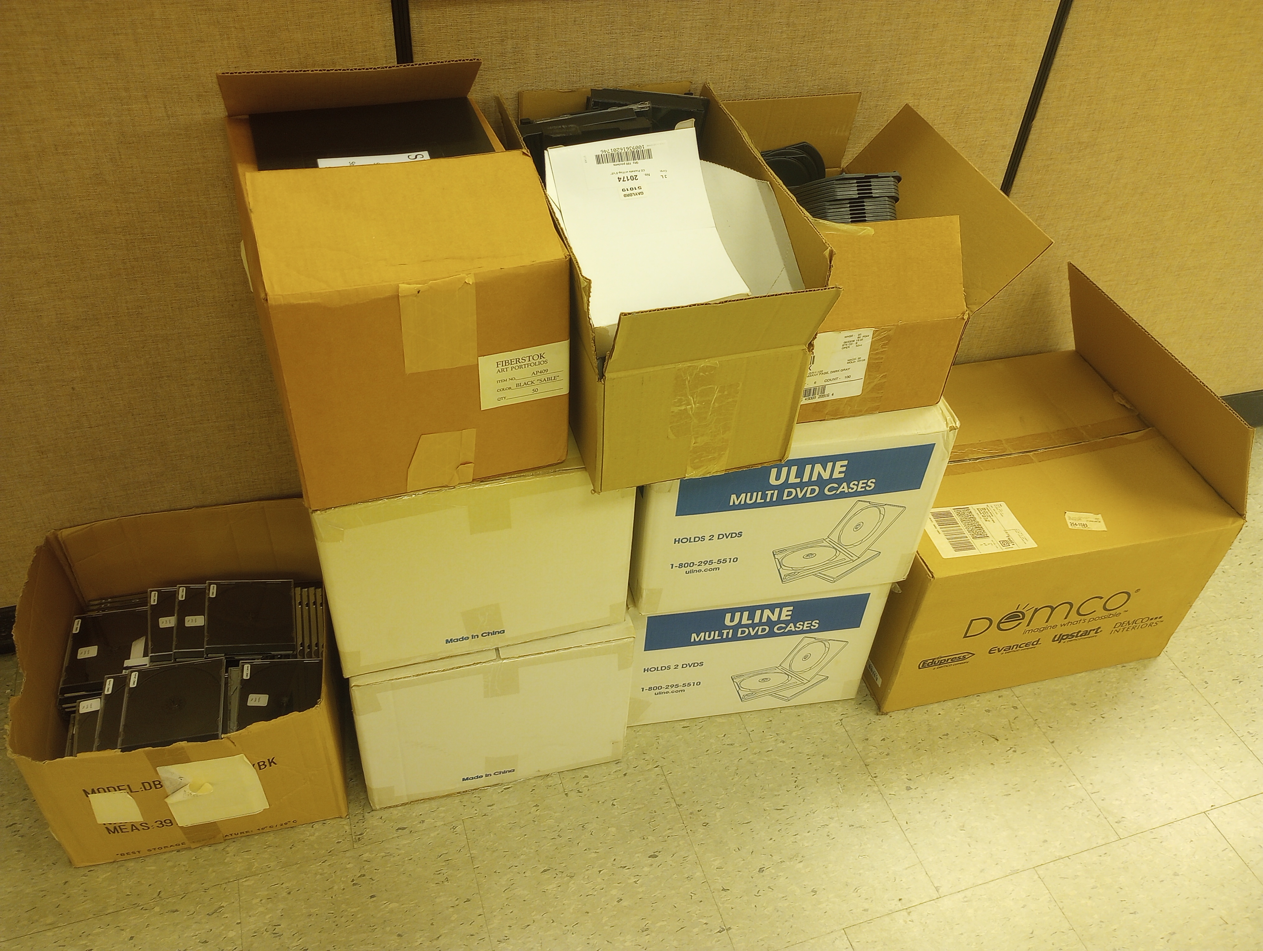 Primarily, we've got over 400 empty DVD cases (never used) and a good supply of empty CD jewel cases (used with crossed out labels). There are also a bunch of inserts for DVD cases to allow them to hold more discs, in case anyone has a burning need for those...