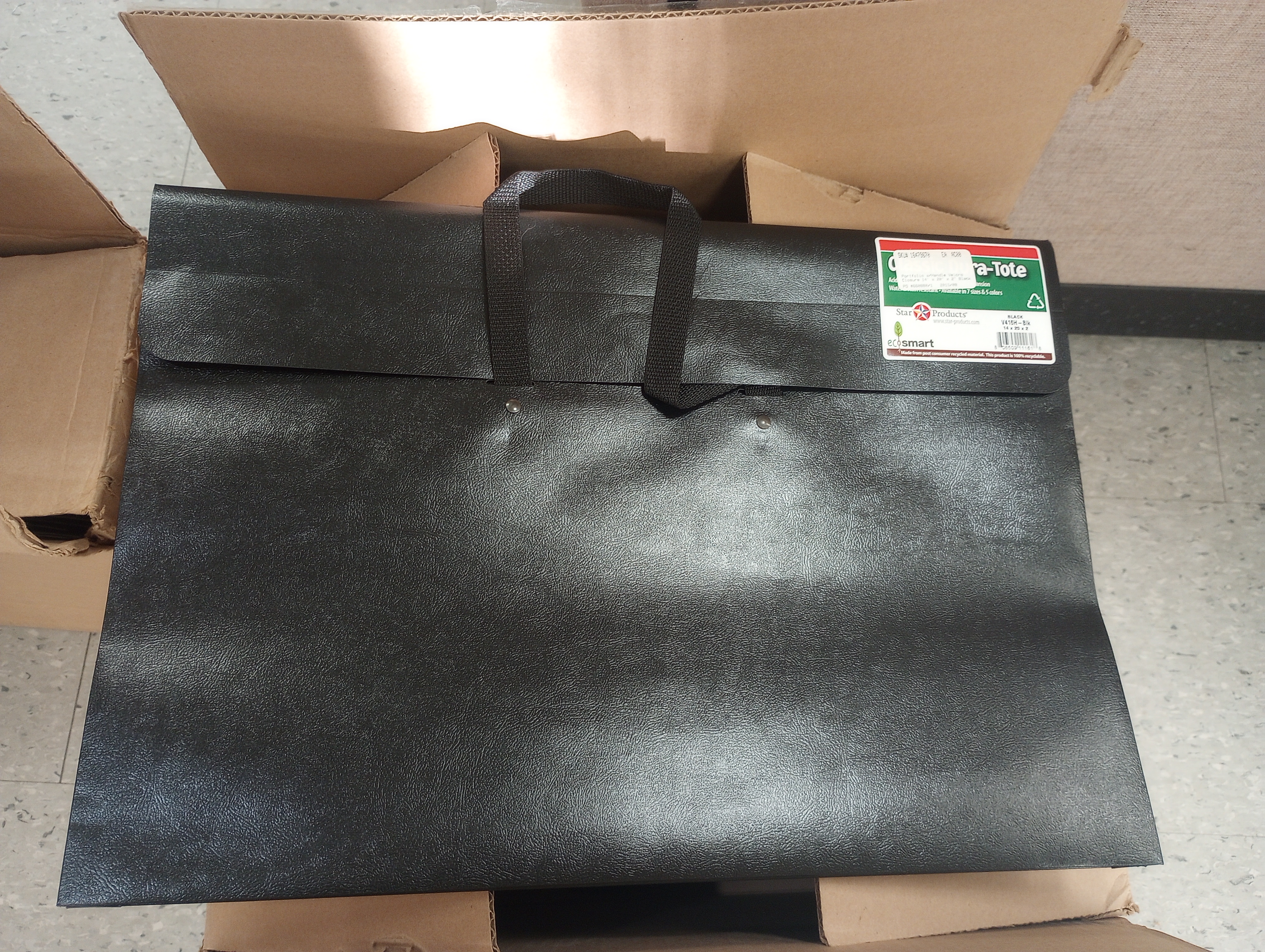 We also have three different sizes of black portfolio folders (one with handles); a variety of sticky labels (some sized for addressing envelopes, some smaller, and most printable); and several desk organizers.