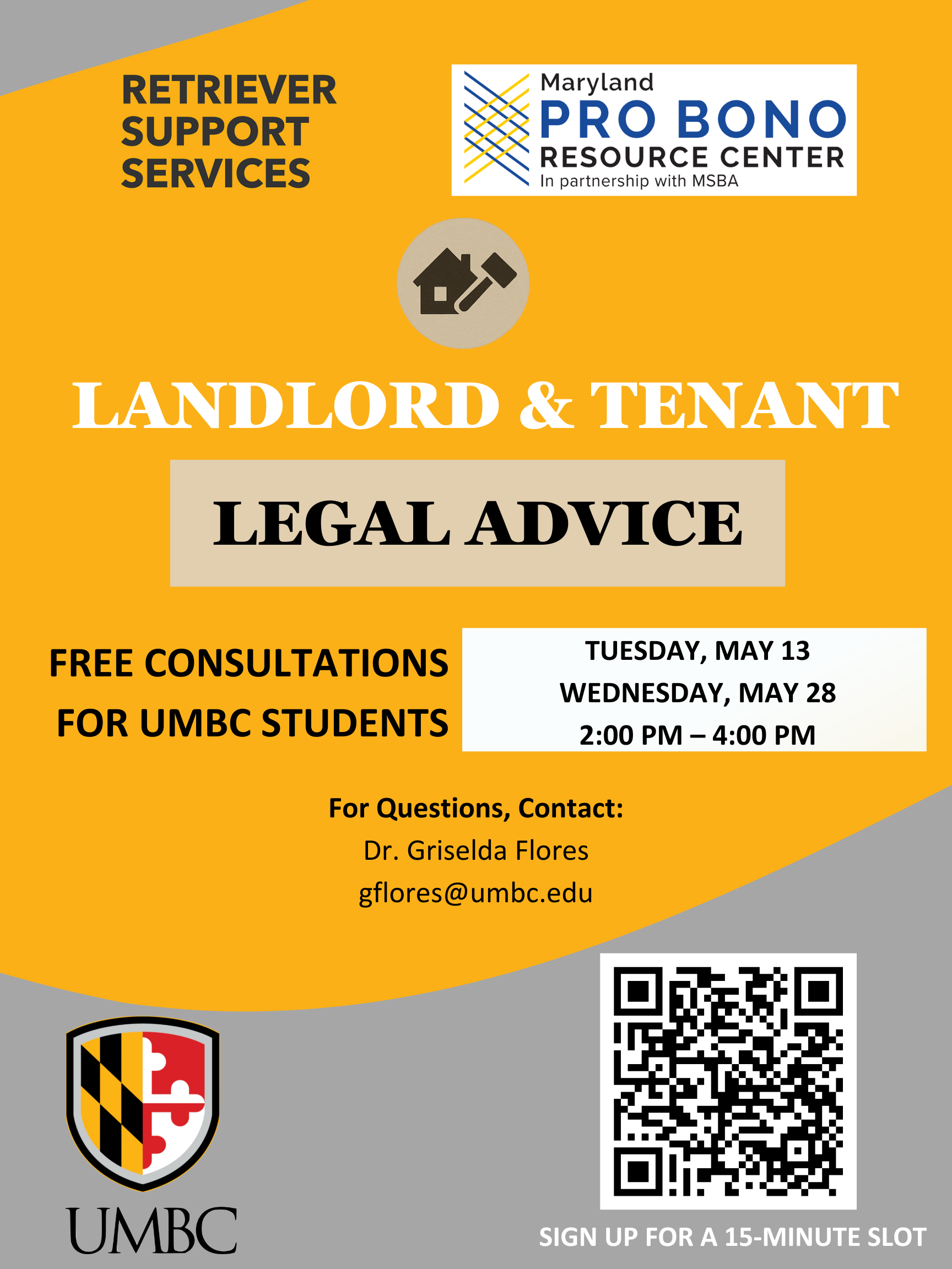 Pro bono lawyers will be available to offer free legal advice to all students! This is a fantastic opportunity for students who are seeking guidance on leases, tenant rights, and other related legal matters. For questions, contact Dr. Griselda Flores at gflores@umbc.edu./