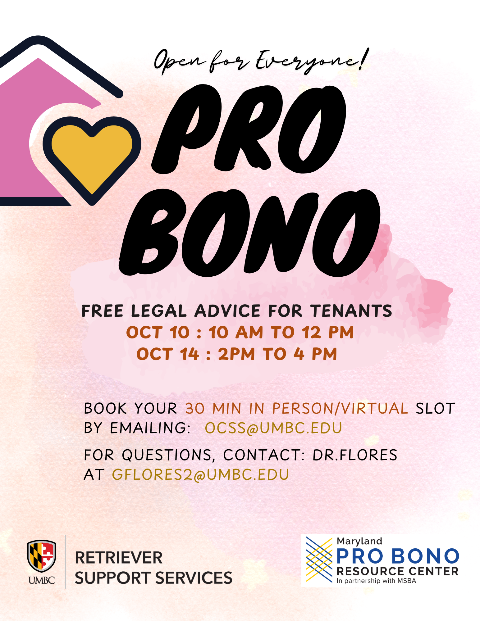 Hello Retrievers! We are offering free 30-minute legal consultations for all UMBC students and staff who need legal advice concerning their leases, on October 10 and October 14!