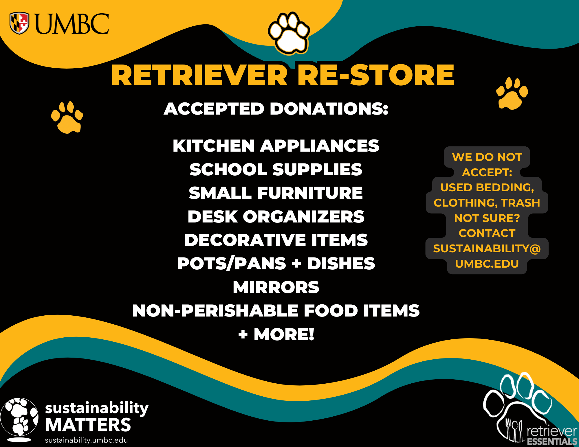 This is the last week to use our green move out collection bins to donate your gently used items to the Retriever ReStore! Once donated, your items are collected and sorted by Office of Sustainability and Retriever Essentials staff so you can shop from them for free at the Essential Space!