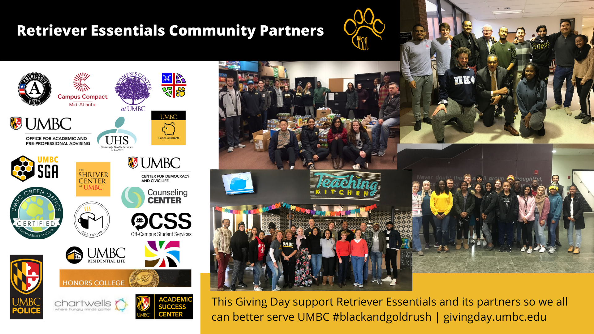 Community Partnership is an integral pillar of Retriever Essentials’. Without our partners we would not have been able to reach to the point where we are. We are able to assist the UMBC community because of their contributions. It is through many offices and departments across the campus that Retriever Essentials is able to collect and distribute food items, personal care products, and meals swipes. Our partners support our efforts to meet the students where they are in order to ensure their well-being and success. This Giving Day, February 27th, please support Retriever Essentials and its partners so we all can better serve our UMBC community.