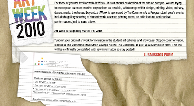 Finally, it's Monday, February 22, which means today is the last day for the $5 commvision credit for Art Week submissions! You can still submit pieces until Wednedsay, but put your best photography, graphic design, or any other kind of art on a flash drive (or email them to commonvision@umbc.edu) and stop by the shop to get help with printing and learn more about Art Week. It's a great cultural even that happens on our campus and don't hesitate to be a part of it! There have been all sorts of submissions in the past, ranging from painting to poetry and film to graphic design. Check out the website and don't miss out! Things have been rough with a week missing due to snow, but take this time to share your work with your peers.