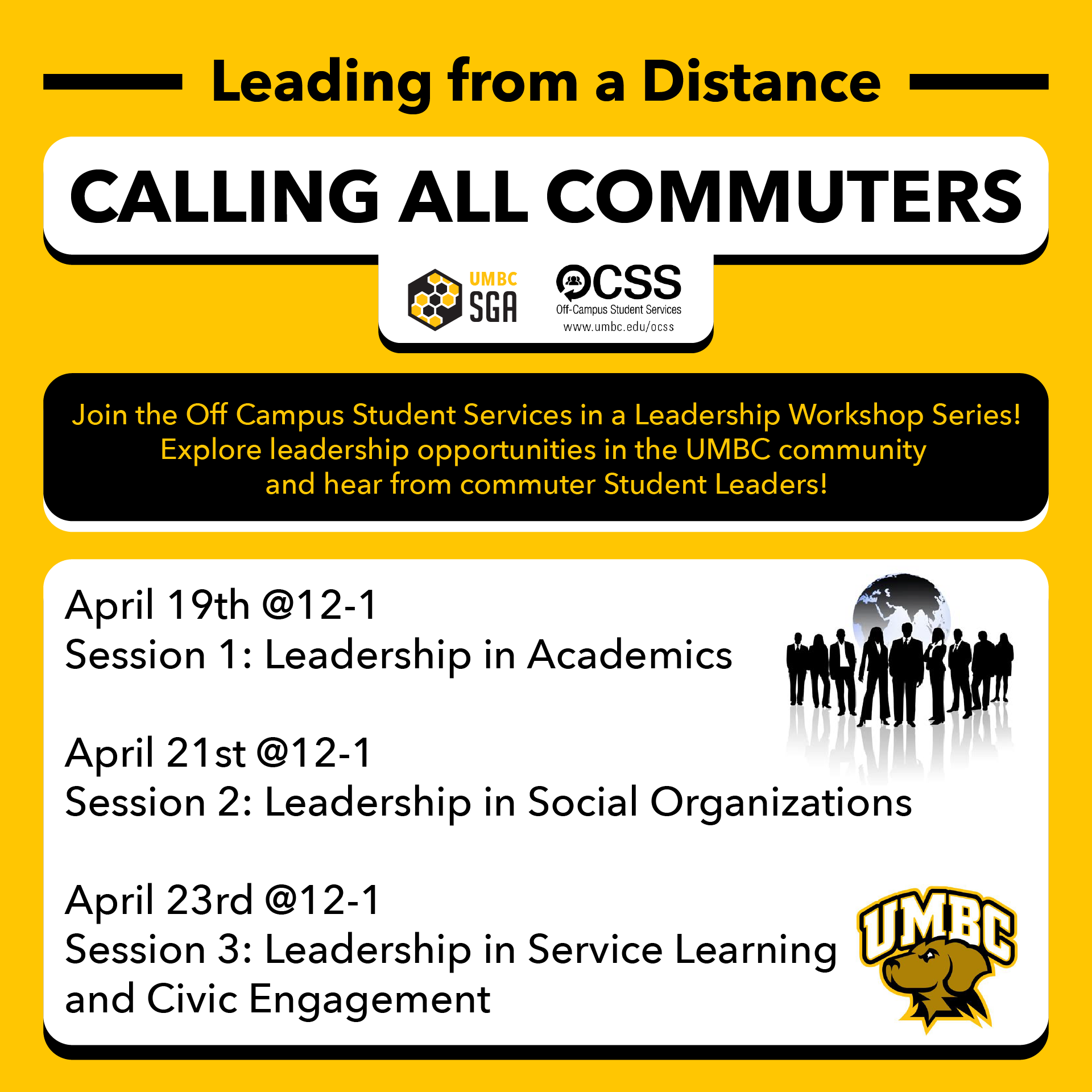 Join OCSS on the following dates for a leadership workshop series that helps students become well-rounded leaders! Hear from commuter student leaders about their own personal experience!